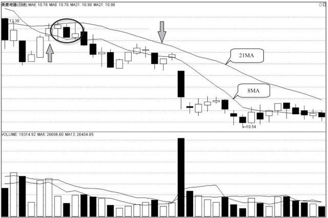 从图中我们可以看出,3月23日,股价成功站上8日均线,随后成交量也呈现逐步放大的态势,并且之后的三个交易日没有跌破3月23日那根K线实体的低点,但是之后该股的涨势却没能延续,在3月29日再次跌破8日均线,并由此展开了一轮近一个月的下挫行情。其实,这主要是由于受到上方21日均线的压制,短线股价很难有大的上涨空间。