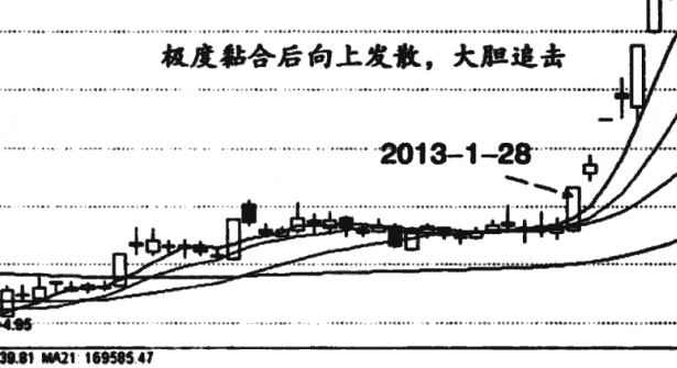 西水股份这个股票我们前面讲过,这里再强调一下买点。如上图所示,该股在2013年1月28日前的走势非常诡异,一个极端扁平的盘整走势,震荡幅度极小,导致三条短期平均线黏合得非常紧密。这是变盘前兆,可特别关注。1月28日该股强势涨停,股价突破了盘整区域同时平均线开始向上发散,说明进人多头走势。两个买人信号共振,是一个非常好的买点,即使追高也不为过。