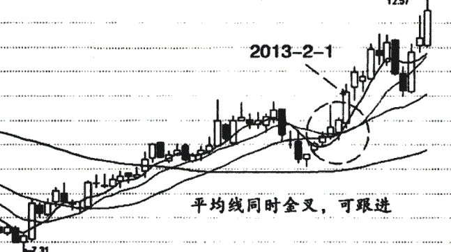 如上图所示,东方财富2013年2月1日收出中阳线,股价突破前高,通常可以跟进做多。这个买入信号也得到了平均线信号的佐证。经过这根中阳线后,5日平均线、10日平均线和20日平均线形成一个活结,同时产生金叉。这说明短期筹码大部分都是盈利盘,有利于股价的推升。同时这个活结出现在60日平均线之上,说明中长期走势向好,对股价形成有力助涨。此时买入是一个安全的买点,可以积极参与。