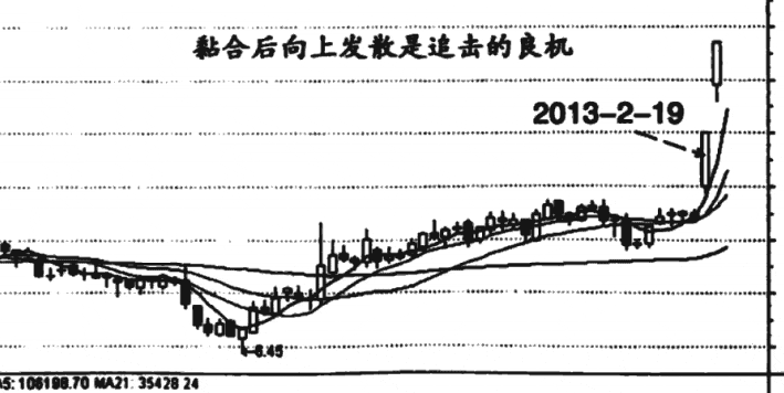 均线黏合是一种蓄势状态,面临变盘,我们前面在选股的时候讲过,这里再强调一下买入时机。平均线黏合未必是向上发散,也可能是向下发散,因此需要等待股价拉起,平均线开始向上发散,那时候才可以参与。一般来说拉起的力度要大,否则平均线发散得不够明显。因此在平均线黏合后 需等待一根中长阳线,即买入时机。