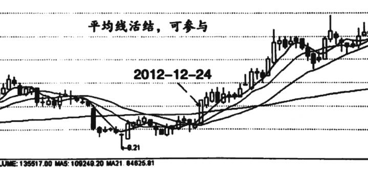 如上图所示,香雪制药2012年12月24日放量大涨,收出长阳线,同时股价回到60日平均线之上,恢复了整体的多头走势,是一个积极信号,可以适当介入。就短线而言,该股经过这根长阳线后,3根中短期平均线产生了一个活结,也就是同时产生了金叉。这说明短期筹码多是盈利状态,也就是多头占据优势,走势自然也是多头走势。结合该股的中长期走势,产生活结是一个极好的买点。