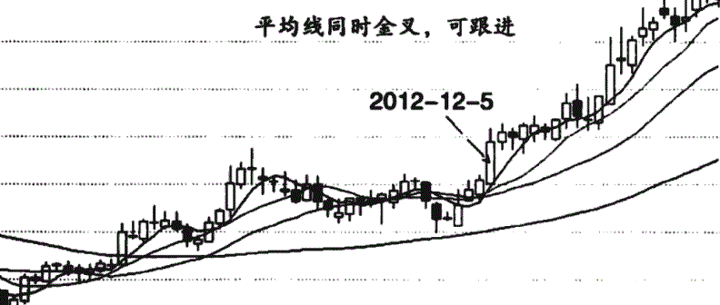 如上图所示,金科股份2012年12月5 H放M大涨,收出长阳线, 股价突破前高,形成一个明确买点。这个买入信号也得到了平均线信号的佐证。当时平均线产生一个活结,说明多线已经是多头强势.从整体看,这个活结在60日平均线之上,说明整体走势是明显的多头走势,对股价有助涨作用。如此几个买入信号共振,是极好的买人时机,可以积极跟进。