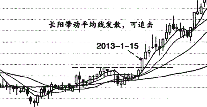如上图所示,上海家化在2013年1月15日前有一段较长时间的盘整,股价的中轴在60日平均线,说明该平均线有一定支撑。1月15日该股大幅上涨,收出中阳线,股价突破了前高,通常是一个买点。同时还有一个更积极的信号出现,那就是平均线由此前的黏合状态变成了多头发散状态,说明真正进入了多头走势中,是一个较好的买点.