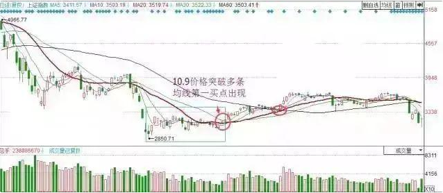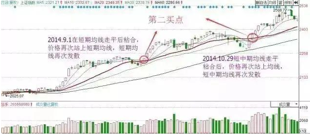 第一买点就是均线粘合后价格第一次站上均线,从此均线开始粘合后的第一次发散。这是就是第一买点。注意是均线粘合后的第一次发散。
