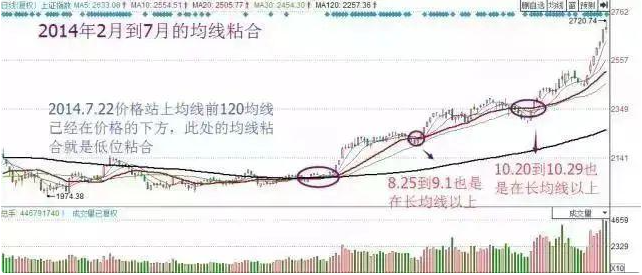 如果之前的走势中,长期均线上向上运行的,则均线系统的粘合主要是由于中短期均线的回调形成,这时候出现均线粘合,说明中短线已经充分调整,在获得长期均线强支撑后将出现反弹走势,波段走强概率大
