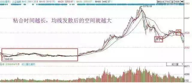 从此推论出均线粘合是主力长期吸筹的结果,所以均线粘合越长发散后空间就越大。