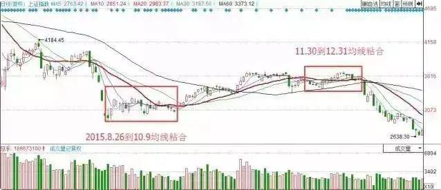 当长期、中期、短期均线粘合的形态出现时,后市的方向选择一般会沿着中长期均线之前的运行方向继续运行。而长期均线的运行方向会告诉我们此处的均线粘合是高位还是低位。