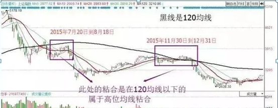 当长期、中期、短期均线粘合的形态出现时,后市的方向选择一般会沿着中长期均线之前的运行方向继续运行。而长期均线的运行方向会告诉我们此处的均线粘合是高位还是低位。