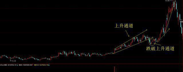 例1:(如图)此票跌破了上升通道进行了短暂的调整后开启了主升浪,从调整底部的6.4涨到了15.4是最有肉的一段千万不可错过。