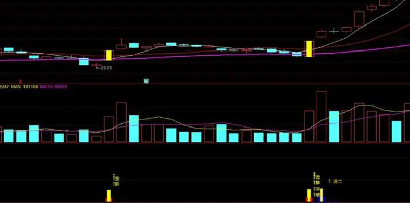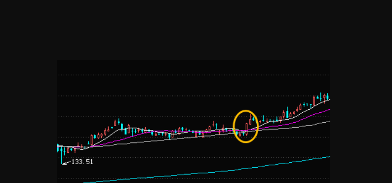 在黄圈123中,都出现了一种现象—一在一根中阳以上的阳线出现后,均线非常快速的拉开了距离,圈2是最明显的。为什么?结合均线的计算原理,因为均线是一系列价格的平均数,当出现一个非常大的数字时,会一下子把平均数提高一个等级,距离就来开了。打个比方,假如几个人月薪都是1万上下9000~10000的区间,那他们的平均工资就是1万左右。结果突然马云进来了,他们的工资一下子就从1万左右变成几十万了,这个差距就很大的了吧,反映到均线上也是这个道理。在中阳大阳线出现前,股价波动空间比较小,K线个头也比较小,所以均线离的很近。但是突然来一根大线,直接把均线平均价提起来了,所以均线就开始离得远了,就不再粘合了。再来个更明显的例子,如下图黄色圈中的大阳线一出,均线直接就分手了。