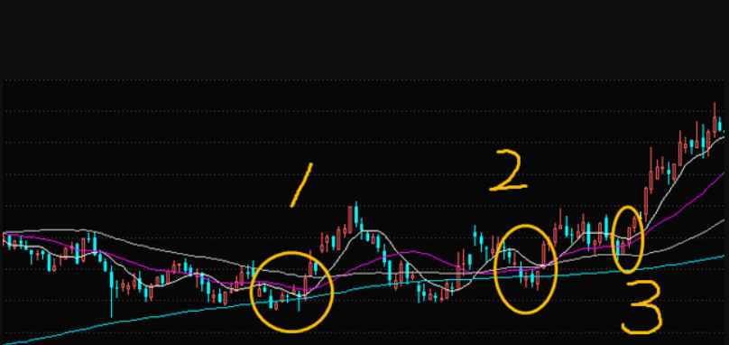 均线如何从粘合变成分手你已经明白了,那如何判断之后的走势就更好理解了。不管是上图还是下图,当中阳线大阳线(我们定义为信号线)出现并收盘后,均线只是分手,并未出现明显的走势变化,但紧接着后面出现一系列阳线之后,均线角度就开始向上倾斜,如第一张图圈2到圈3的过程。圈2信号线出现后,紧接着出现2~3根阳线,直接把均线的金叉都给做出来了,尽管后面的调整跌破了均线,但均线依旧多头排列(均线多头排列就是均线从下到上分别是短中长期均线)。在圈3再次出现连续阳线尤其第一根大阳出现之后,几条均线彻底分家,股价加速上涨。