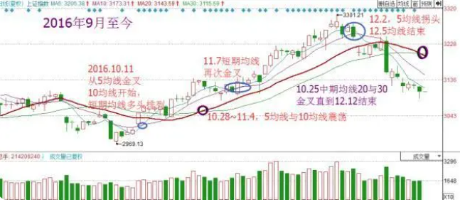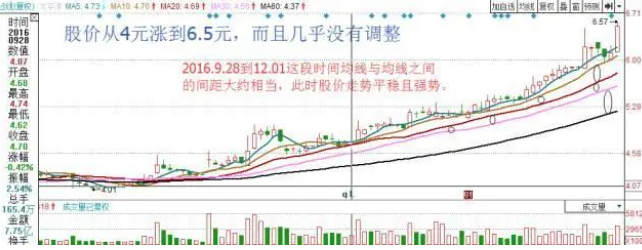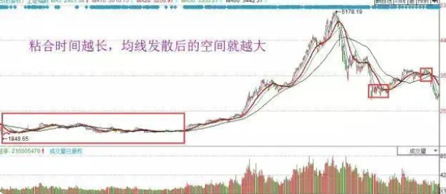 当股价走平或者在一个区域横盘震荡就会使短期均线和中期均线扭到一起,有时长期均线也会扭在一起,均线与均线的间距很小甚至有时重合。这样的现象就是均线粘合