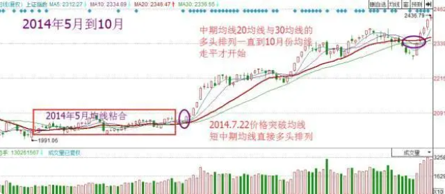 其后价格一路上涨就会把中期均线和长期均线扭成多头排列。