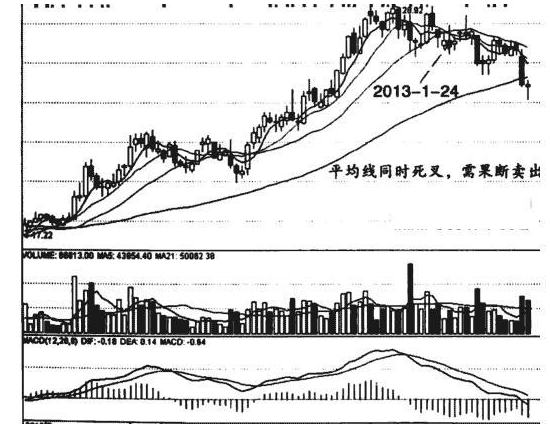 如上图所示,该股前期大幅上涨,然后在高位盘整,但不好判断是否盘头。2013年1月24日,该股收出小阴线,跌势不强,但平均线出现死结,说明走势已经真正变坏,投资者需离场。此后股价虽有反弹,但无力修复已经走坏的平均线系统,继续下跌已经不可阻裆,投资者更需回避。