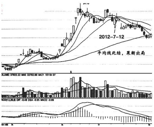 如上图所示,该股前期大幅上涨,然后震荡下跌,跌速不快。 2012年7月12日该股小幅上涨,由于这个位置有前低支撑,此时又是两连阳,很可能有投资者进场博取短线的飙升。事实上投资者当时不但不能进场,还应该趁反弹逃命。因为两天反弹的结果是平均线产生了一个死结,这不仅是反弹虚弱的表现,更严重的是整体走势已经变坏,下降趋势基本形成,至少有中级以上的调整,投资者应该果断离场。