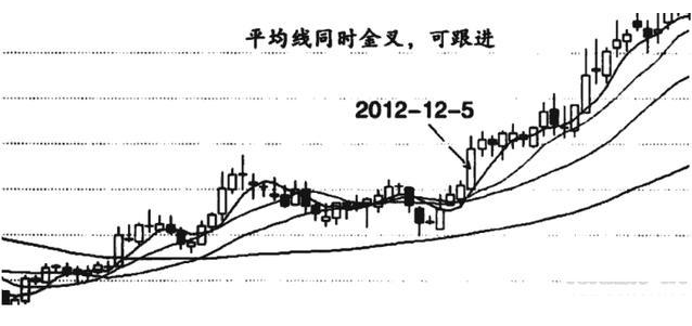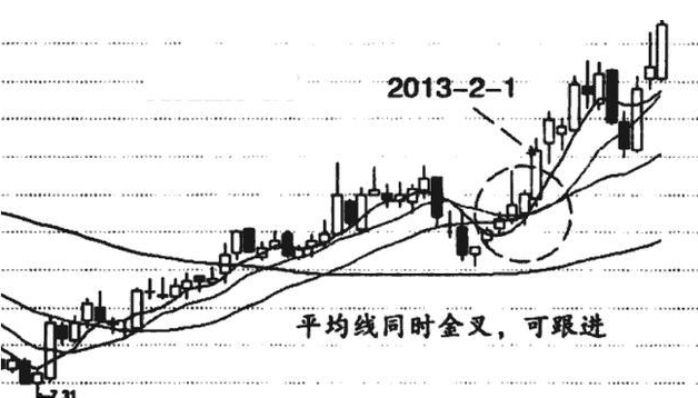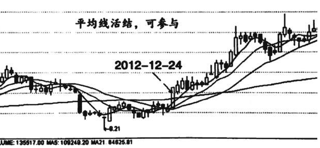 如上图所示,该股2012年12月24日放量大涨,收出长阳线,同时股价回到60日平均线之上,恢复了整体的多头走势,是一个积极信号,可以适当介入。就短线而言,该股经过这根长阳线后,3根中短期平均线产生了一个活结,也就是同时产生了金叉。这说明短期筹码多是盈利状态,也就是多头占据优势,走势自然也是多头走势。结合该股的中长期走势,产生活结是一个极好的买点。