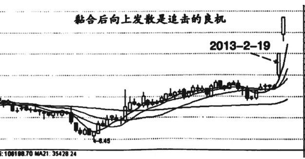 均线黏合是一种蓄势状态,面临变盘,我们前面在选股的时候讲过,这里再强调一下买入时机。平均线黏合未必是向上发散,也可能是向下发散,因此需要等待股价拉起,平均线开始向上发散,那时候才可以参与。一般来说拉起的力度要大,否则平均线发散得不够明显。因此在平均线黏合后 需等待一根中长阳线,即买入时机。