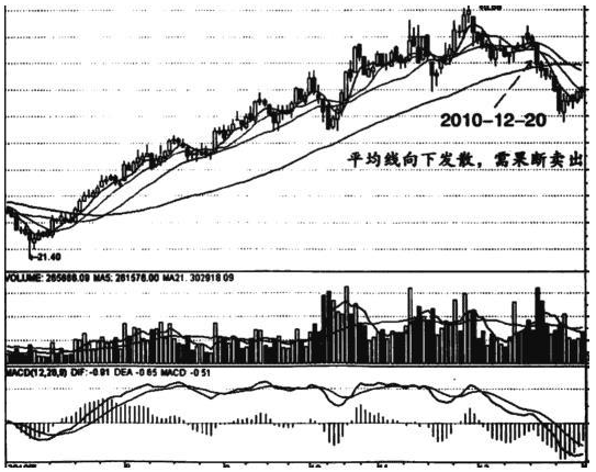 如上图所示,该股在2010年下半年震荡上升,整体涨幅不小, 接近翻倍。该股到12月有所走弱,无力创出新高。12月20日该股放量下跌,资金出逃迹象明显,投资者应该跟随出局。更为严重的是,该股经过这么一跌,平均线系统开始走坏.由此前的黏合状态变成了向下发散,说明整体走势开始向下,投资者需果断离场。平均线黏合是蓄势的表现,向下发散会形成很强的杀跌力量,投资者更应警惕。