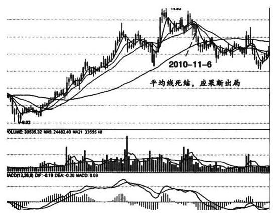 如上图所示,该股在2010年11月6日收阴,跌幅并不大,但整体走势却已经被破坏。从平均线角度看,当时该股的平均线出现一个死结,说明整体趋势下倾,后市继续下跌的可能性极大,投资者需果断离场。此后该股虽然有反弹,但股价无力回到死结之上,更无力修复平均线系统,后市很可能大幅下跌,需果断止损。
