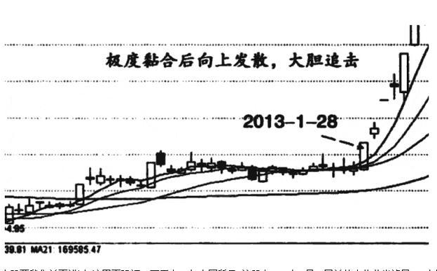 如上图所示,该股在2013年1月28日前的走势非常诡异,一个极端扁平的盘整走势,震荡幅度极小,导致三条短期平均线黏合得非常紧密。这是变盘前兆,可特别关注。1月28日该股强势涨停,股价突破了盘整区域同时平均线开始向上发散,说明进人多头走势。两个买人信号共振,是一个非常好的买点,即使追高也不为过。