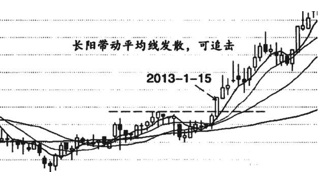 如上图所示,该股在2013年1月15日前有一段较长时间的盘整,股价的中轴在60日平均线,说明该平均线有一定支撑。1月15日该股大幅上涨,收出中阳线,股价突破了前高,通常是一个买点。同时还有一个更积极的信号出现,那就是平均线由此前的黏合状态变成了多头发散状态,说明真正进入了多头走势中,是一个较好的买点。