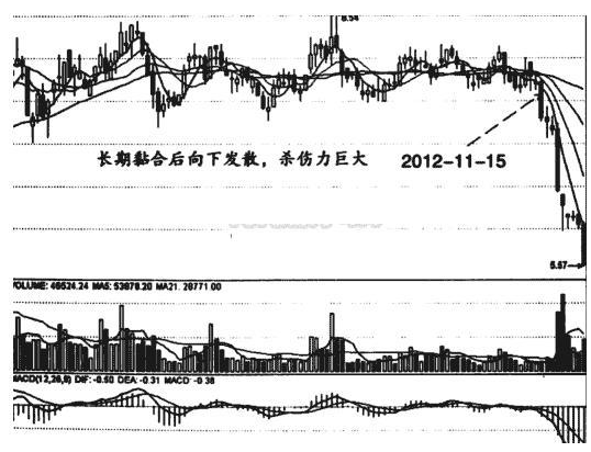 如上图所示,该股在一个位置长时间横盘,4条平均线逐渐黏合在一起,很多投资者可能以为这是蓄势上涨,甚至有投资者迫不及待地进场潜伏。2012年11月15日该股大幅下挫,同时平均线系统开始向下发散。 此时我们要意识到这是暴跌的开始,持股的投资者应该果断止损。长期蓄势未必是上升,假如向下破位,攻势也非常猛烈,投资者必须无条件止损。