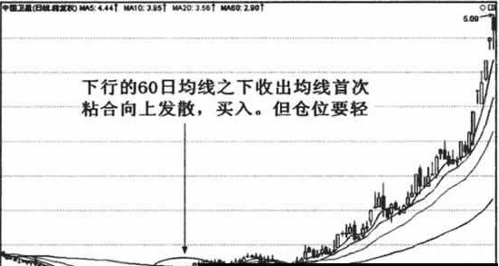 如图所示,中国卫星(600118)。下跌末期杀跌动力减弱,股价横盘整理。在筑底过程中,出现均线首次粘合向上发散形态,看涨信号,买入。因为60日均线还在下行,股价仍旧运行在下降趋势做,因此这是一个消极的买入信号,只能先按照反弹行情来做,所以买入仓位要轻。