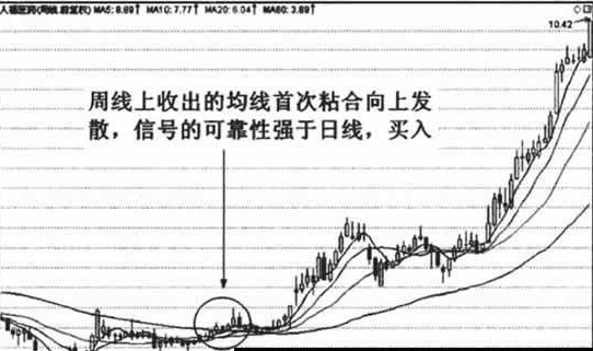 均线首次粘合向上发散的买入点在股价或指数向上突破均线粘合形态,以及均线多头发散的初期。
