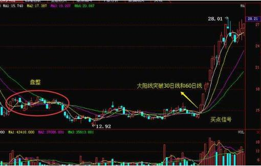在K线图解中,常常会看到均线粘合形态,而均线的粘合多是由于股价的整理才产生的。而股价的整理要么是底部的整理或者是相对的拉升中途的整理。而此时一旦一根大阳线打破粘合的均线,股价依据穿过均线粘合区,那么股价将会开始上攻。