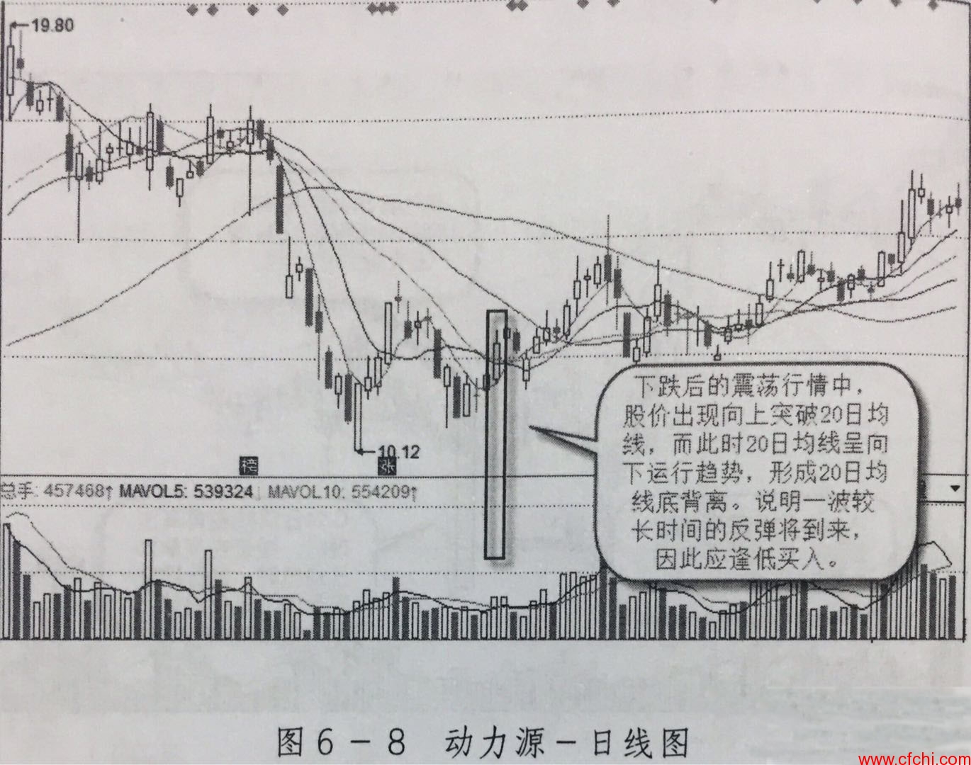 经过前期的下跌后,动力源在2016年1月中旬时步入震荡行情,在创出10.12元的新低后,股价出现震荡回升,到2月3日时,股价在回踩1月14日创出新低的长阳线并获得支撑后,突然出现向上突破20日均线,但此时的20日均线正处于向下运行的趋势,从而形成20日均线底背离。这说明股价在震荡向上的过程中,得到了20日均线的支撑,一波较长时间和涨幅的反弹即将到来。因此,投资者应以波段操作的思维,在此时选择买入股票,如图6- 8所示。