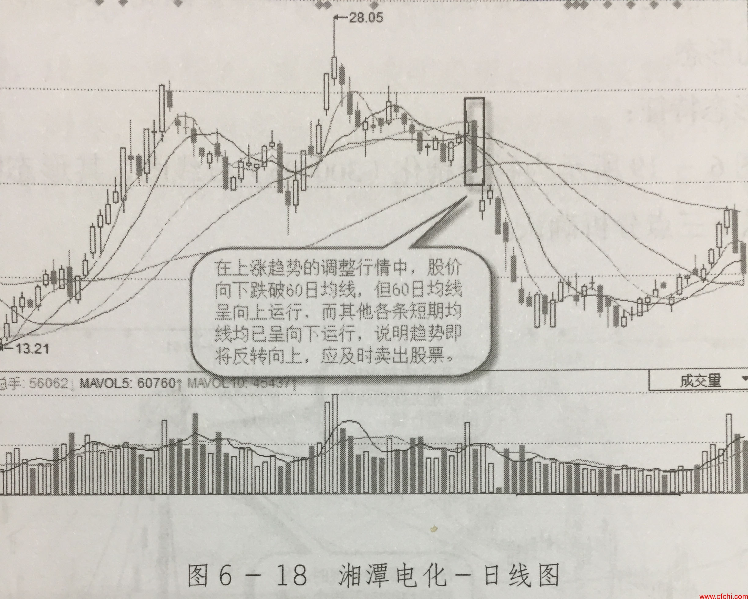 经前期明显的上涨后,湘潭电化的股票价在实现翻倍后,于2015年12月9日出现调整,当2016年1月4日向下遇到60日均线时,出现了一根放量长阴线,股价收盘在60日均线之下,虽然60日均线此时依然向上运行,但其他各条短期均线,如5日、10日、20日、30日均线均已星明显的向下运行,形成60日均线顶背离。这说明股价经过大幅上涨后,主力资金此时在高位服荡中不断出货,导致股价向下跌破60日均线, 表明股价即将出现趋势反转。因此,投资者应在60日均线顶背离出现时, 及时卖出手中股票,如图6- 18所示。