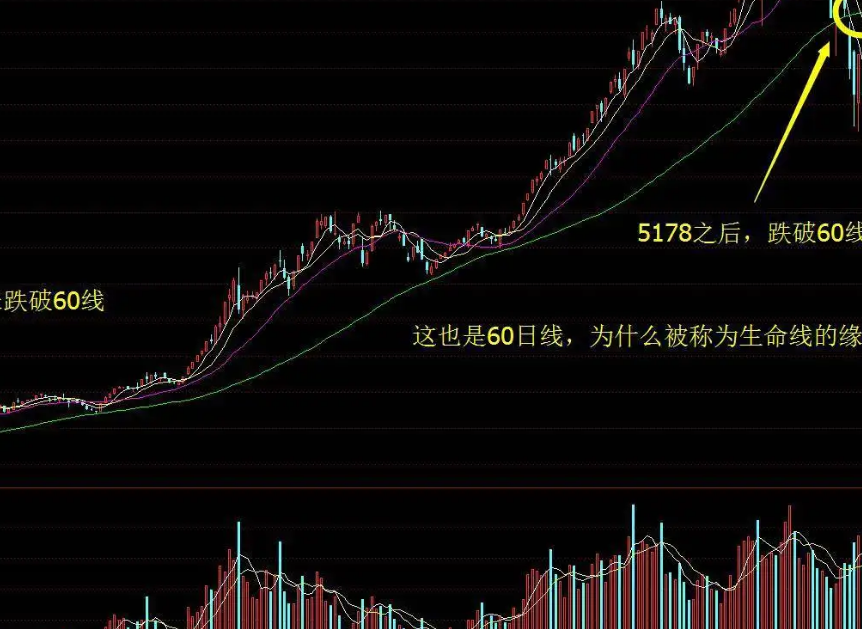 (1)在大牛市行情中,股价也会出现跌破60日均线,但此时的成交量 相对较小,并且一旦跌破,即会出现快速反弹,会围绕60日为线进行震荡,或在其上,或在其下,但成交量会呈阴量逐步缩减,阳量增加的状态。
