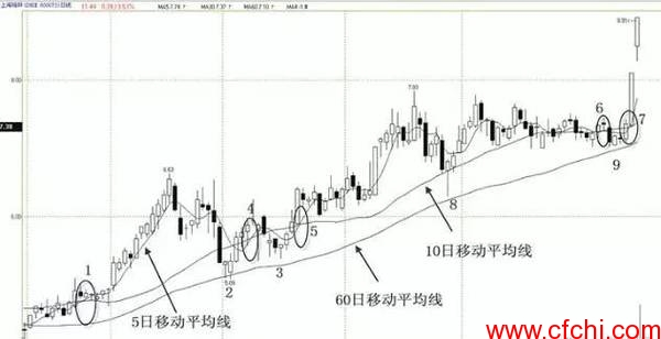 箭头8处对60日均线的考验以锤子线结束。通过将移动平均线与蜡烛图相结合,大大加强了判断的可靠性。