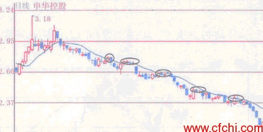 在 下跌行情中,若跌破均线,均线就会转换为压力线,股价在其压制下走低。一方面,不同周期的压力线代表的压力作用不同;另一方面,股价在某条均线受到压力的 次数越多,股价再次碰到该均线向上突破的概率的越小。由于压力线是失守的支撑线,显然常用的压力线也是5日、10日、20日、30日、60日和120日均 线。