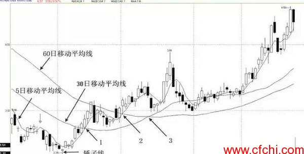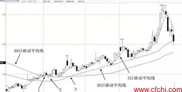 如图3-5所示,5日移动平均线分别与30日移动平均线、60日移动平均线形成金叉(箭头1),随后30日移动平均线向上与60日移动平均线形成金叉(箭头3),三条移动平均线围成了一个封闭的三角形谷底(箭头2),就是黄金谷。