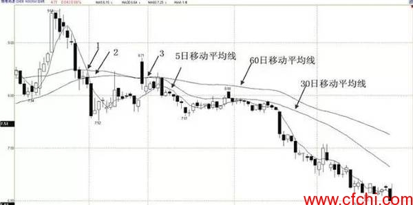 如图3-10所示,5日移动平均线分别与30日移动平均线、60日移动平均线形成死叉(箭头1),随后30日移动平均线向下与60日移动平均线形成死叉(箭头3),三条移动平均线围成了一个谷(箭头2),就是死亡谷。