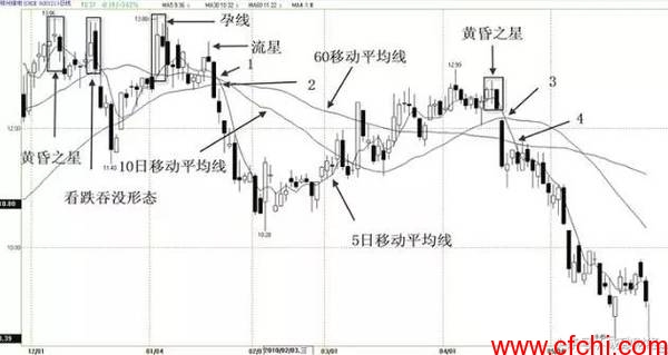 如图3-8所示,股价在高点分别出现了高位孕线和黄昏之星,这些顶部反转形态说明顶部压力极大,短期和中期移动平均线出现平缓下滑的迹象。流星之后的长阴一举穿透了长期、中期和短期移动平均线,称作断头铡刀,是卖出信号,随之而来的是5日移动平均线向下在点1处跌破10日移动平均线发出卖出信号,又在点2处跌破60日移动平均线,发出了更强的卖出信号,股价出现大幅下跌,跌破了前期低点。