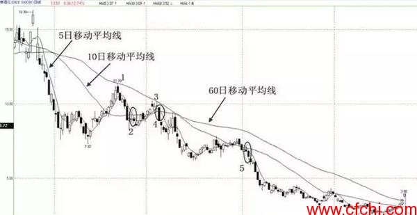 注意点2处的交叉,股价仅小幅回落便再度冲击60日移动平均线,60日均线又一次经受住了考验,点3处又是一个卖点,股价受压下跌,5日移动平均线二次死叉了10日移动平均线,按照卖点解析所述,二次死叉坚决卖出,可以看到这次的卖出点效果比点2处的一次死叉准确得多。点5处的死叉使股价又一次开始了下跌,将股价送入了谷底。