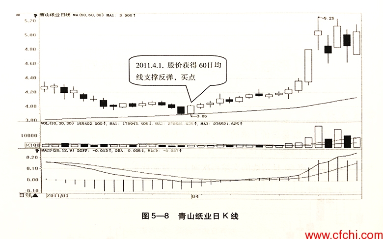 如图5-8所示,2011年4月1日,青山纸业(600103)股价下跌到60日均线位置获得支撑。这是股价将见底反弹的信号。当股价脱离60日均线支撑再次上涨时,买点出现。