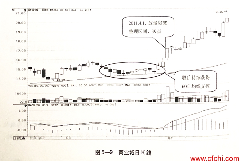 如图5-9所示,2011年3月,商业城(600306)股价回落到60日均线位置后获得有效支撑。之后股价持续在60日均线位置整理,并没有明显上涨。