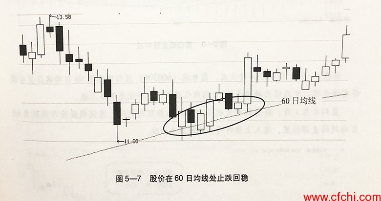 2.如果股价下跌到60日均线位置止跌回稳,就表示股价在这个位置获得支撑未来一旦股价脱离60日均线的支撑再次向上,就形成买入机会,如图5-7所示。