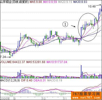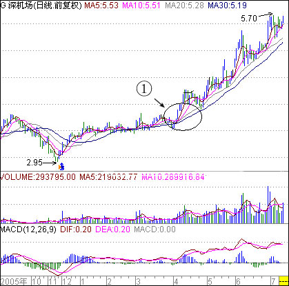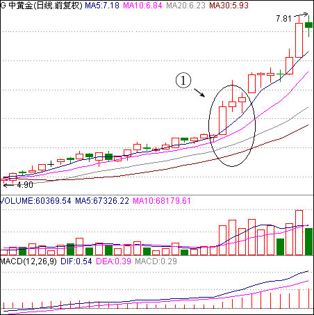 均线多头排列选股法,就是挑选那些低位经过一段时间震荡横盘吸货之后,开始启动的个股,初期呈现均线多头排列的时候,可以及时跟进,会有极大收益。前提是你对个股的基本面分析要有一定的水平,多挑选那些业绩>0.10元的个股,最好有基金重仓!图中①处,该股涨停板放量启动进攻,均线开始多头排列,可以在股价贴近5日或10日均线处买入。