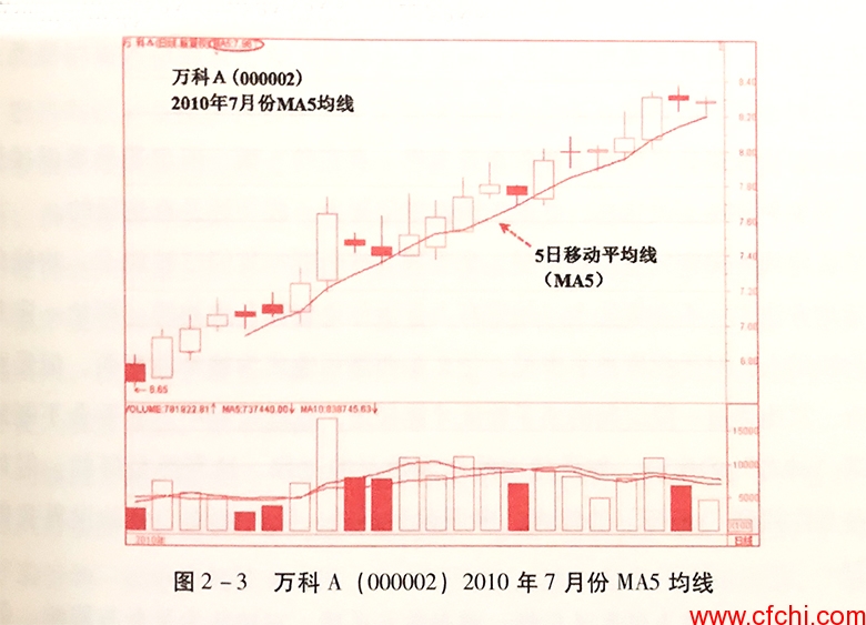 我们把表2-1中的MA5数据表现在股票行情软件中,如图2-3所示。从图2-3中可以看到个股万科A(00002)在7月的前四天是没有MA5均线的,由于MA5均线的算法是选取最近5天内的收盘价的算术平均值,因此MA5均线从第五交易日7月7日开始,这与表2-1中前四天的MA5均线值是空值相对应。