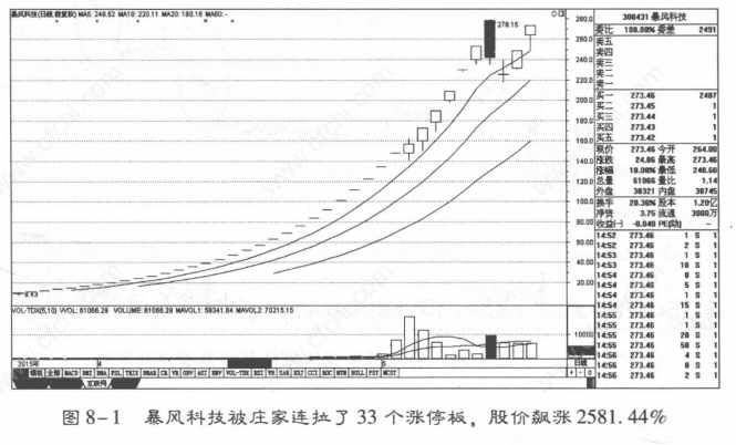 中小板、创业板流通盘极小,少则几千万,多则数亿元,极易被小庄控盘,所以出现了2015年的“妖股”暴风科技被庄家连拉了33个涨停板,股价由9.43元拉至252.86元,飙涨2581.44%的奇事((图8-1)。