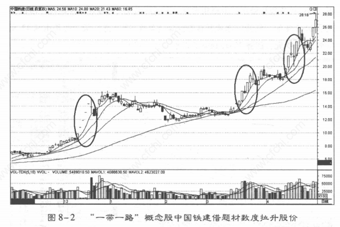 题材和概念的运用是我国证券市场的一大特色。我们几乎天天都可以在各个媒体上看到或是听到各种各样的题材和概念,这些都是庄家利用出货的借口,如“一带一路”概念股中国铁建就曾借题材数度拉升股价(图8-2)。在庄家的操作步骤中,出货是最为关键的一点,因此,题材的选用也就十分重要了。