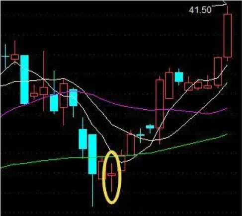 形态介绍:上涨形态。在下跌趋势中,出现一根带有较长的上下影线小阴线或小阳线,形状如螺旋桨,称为低位螺旋桨。