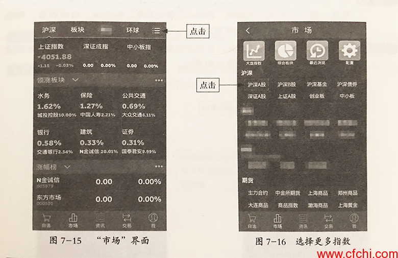 步骤2:如果这些还不够用,还想同时看到更多的指数,用户可以点击右上角的昌:按钮进入“市场”界面来添加,如图7-16所示。