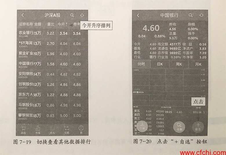 步骤5:在“证券名称”标签栏滑动屏幕,用户还可以切换查看总金额、量比、今开、:最高、最低、昨收、市盈率、总股本、流通股本、总市值、每股收益、每股净资等数据排行,如图7-19所示。