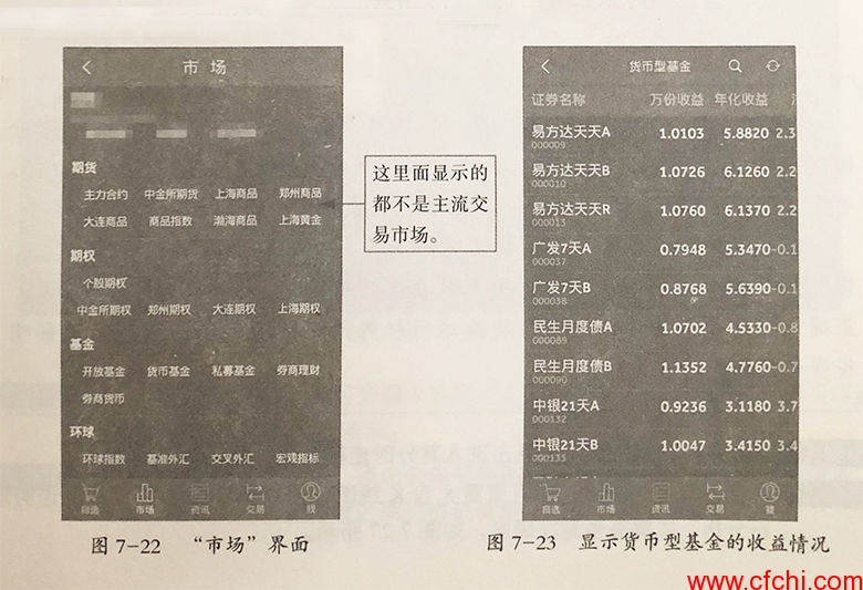 步骤9:点击其中任何一个按钮,都会显示出按钮所代表的市场,如点击“货币基:金”,将显示货币型基金的收益情况,如图7-23所示。