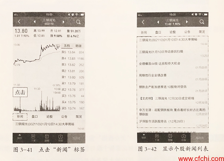 步骤1:在个股界面下方,点击“新闻”标签,如图3-41所示。